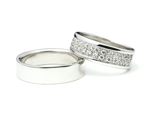 Luxusní pár snubních prstenů s výrazně vybroušenými liniemi. Povrchová úprava je kombinací broušeného matu s vysokým leskem.